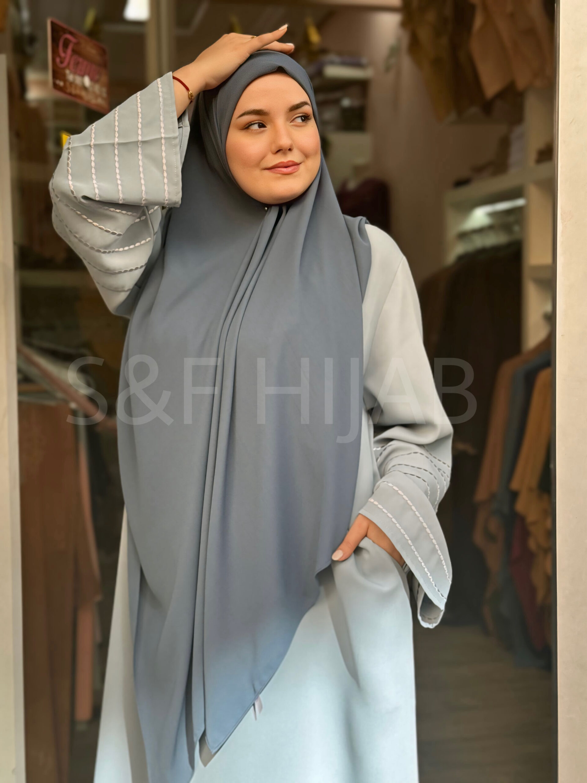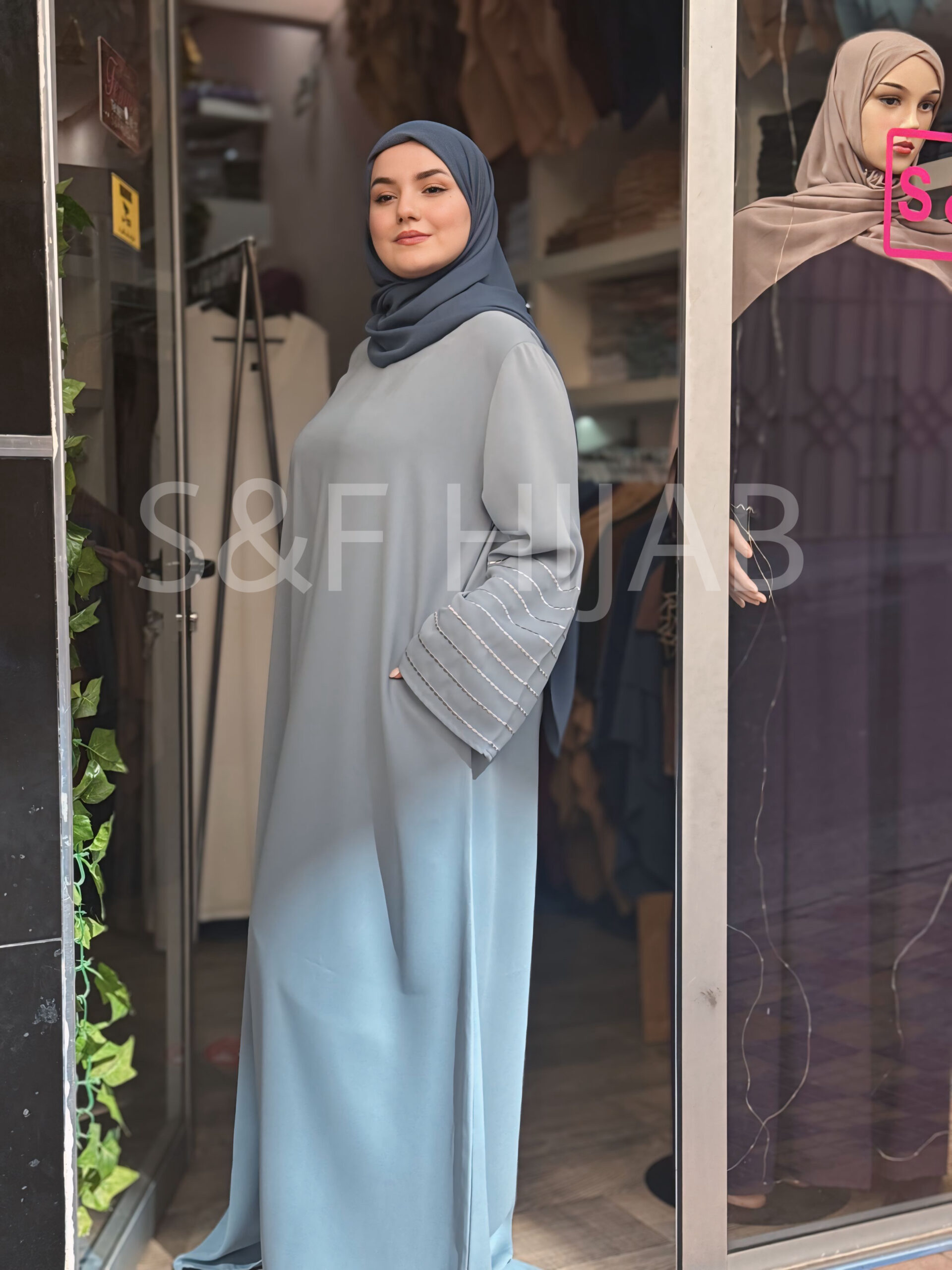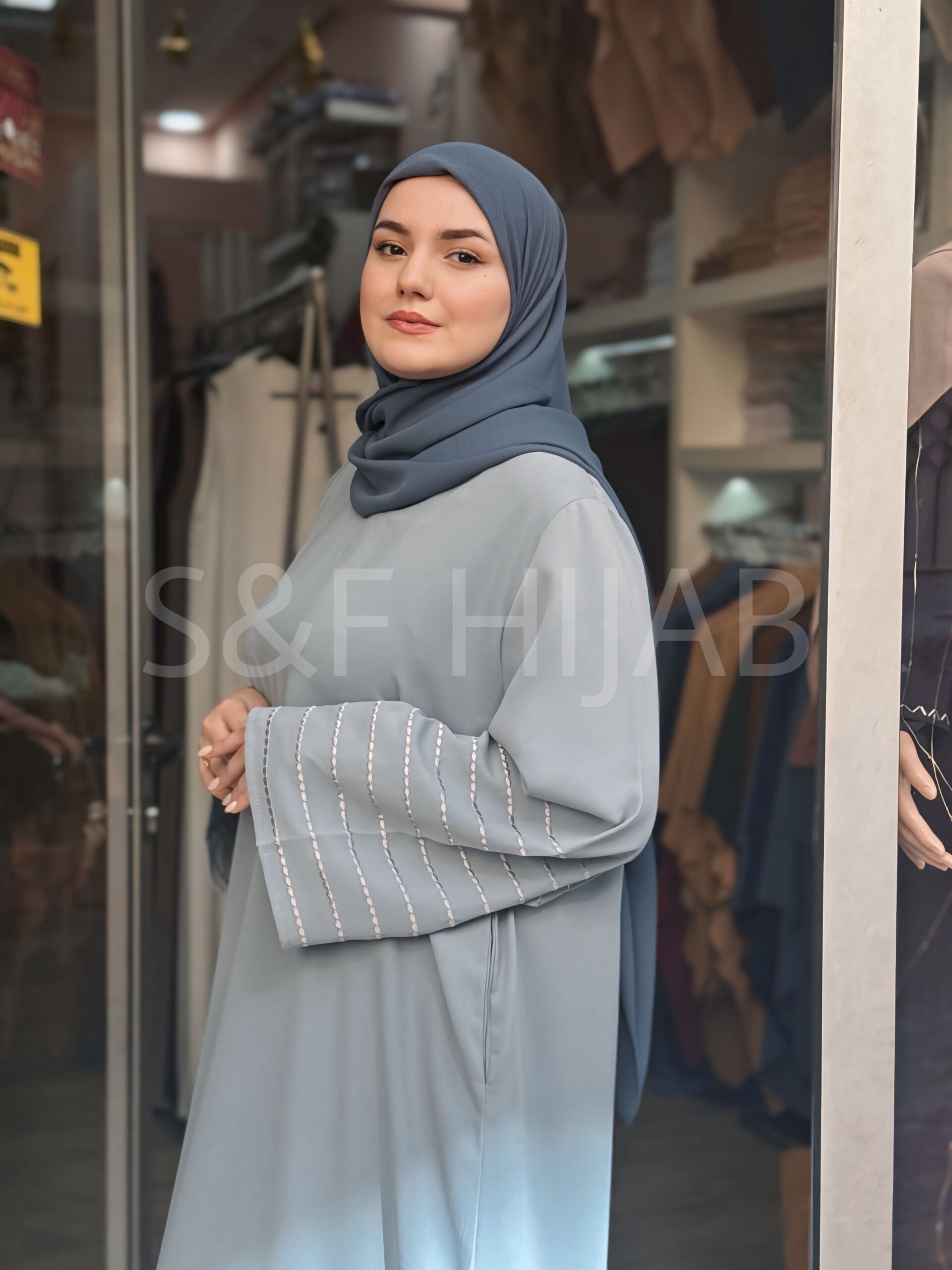 عباءة باللون رمادي مفتوح مطرزة على اليدين بشكل بسيط و أنيق