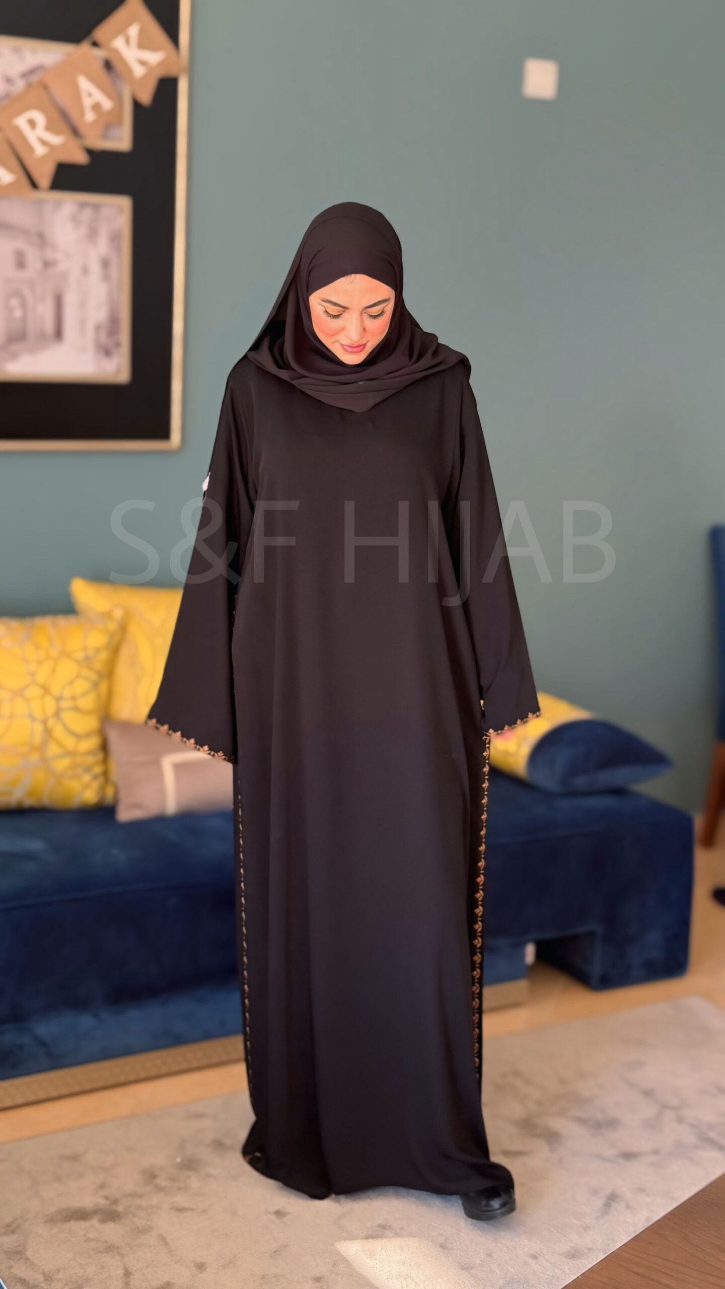 عباءة باللون الأسود مطرزة على اليدين و من الجانبين تتوفر على جيوب جانبية