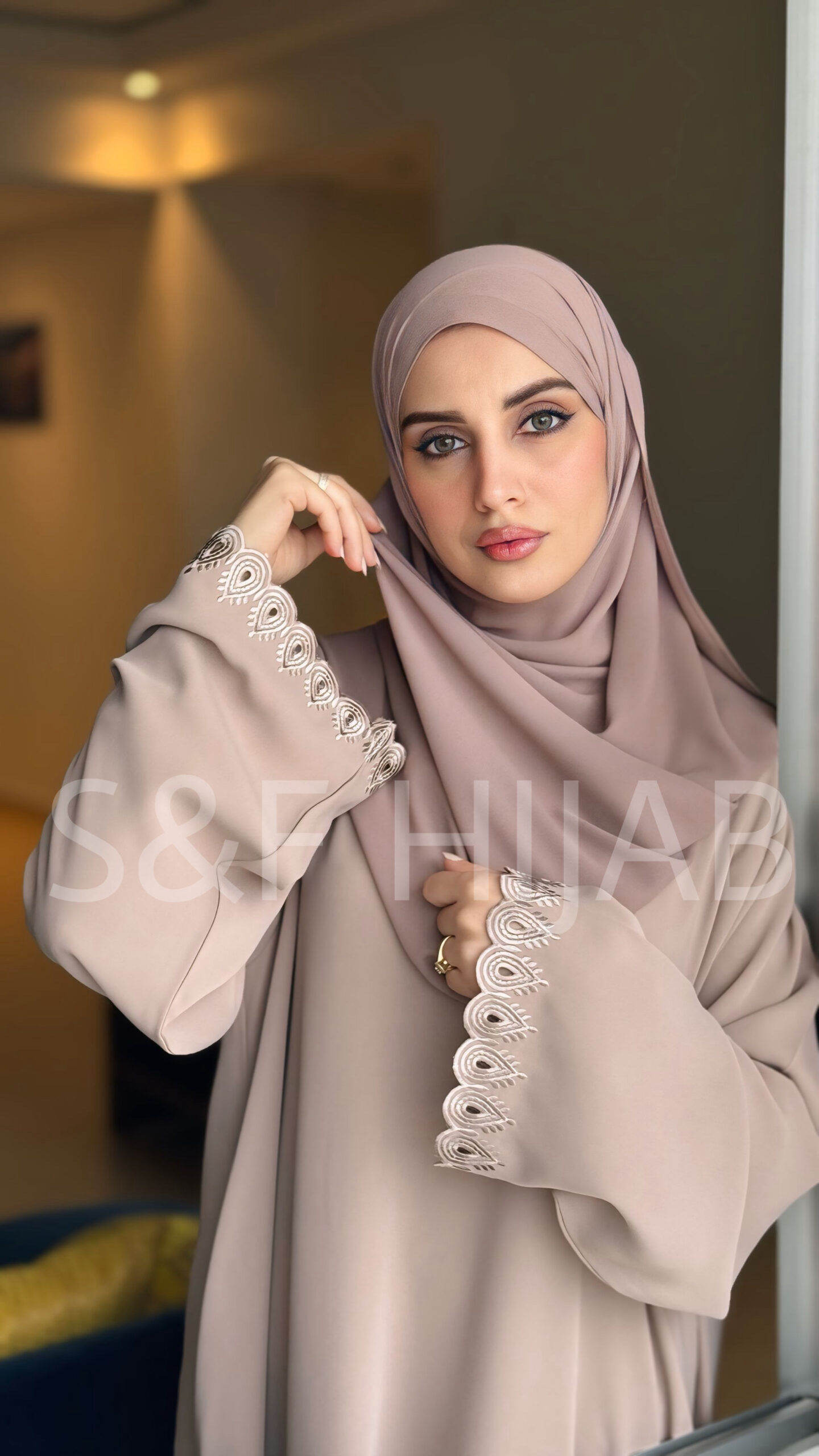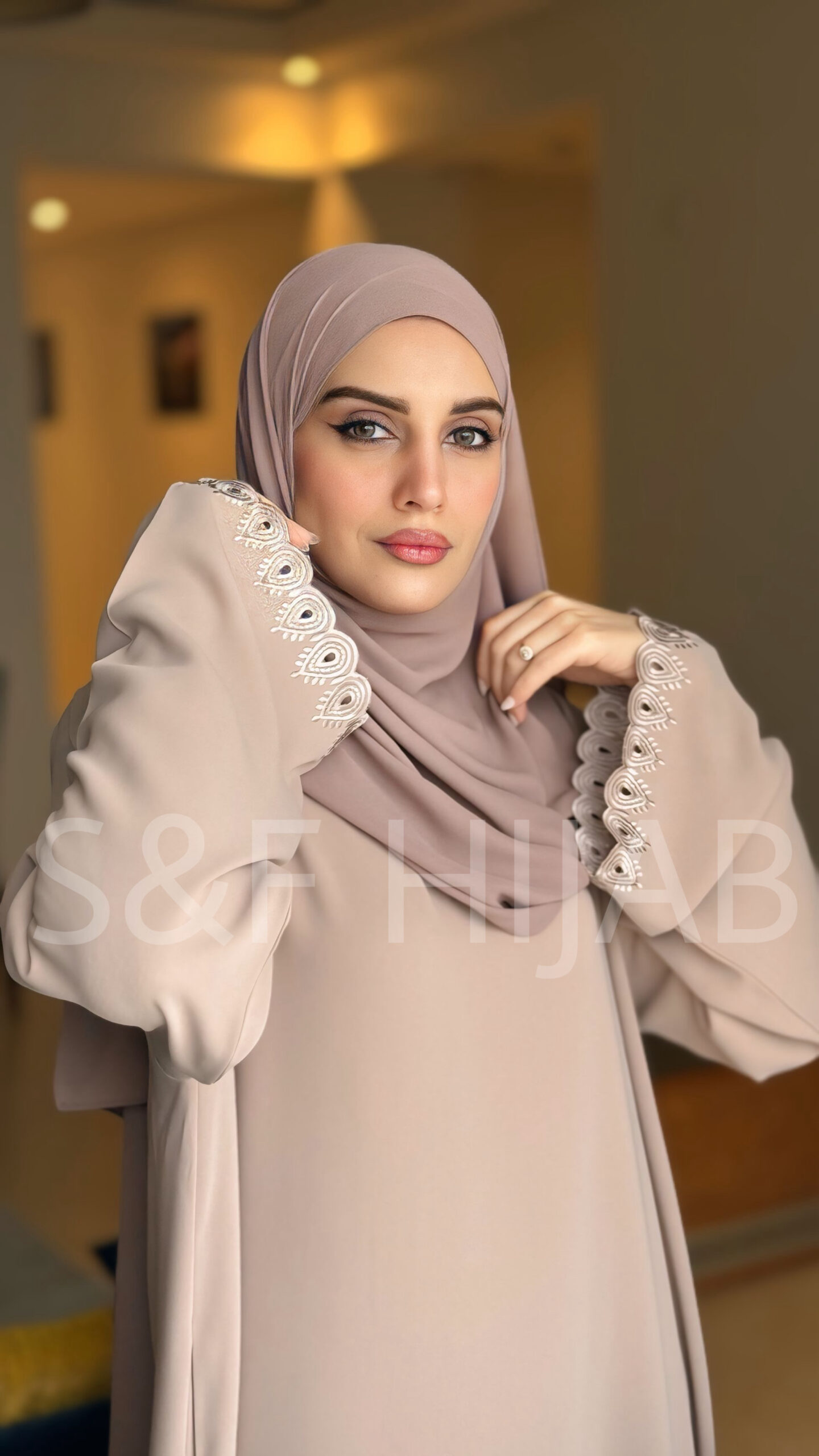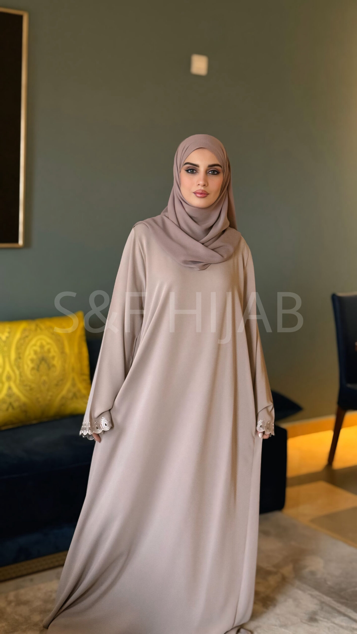 عباءة بلون الترابي الفاتح مطرزة على اليدين