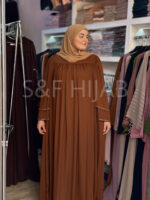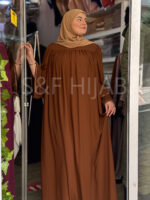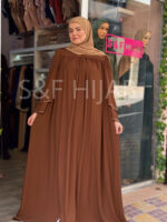 فستان باللون الكراميل الغامق مبطن من الداخل يتوفر على جيوب جانبية و على طبقتين من الاكمام مزينة على اليدين باحجار نحاسية