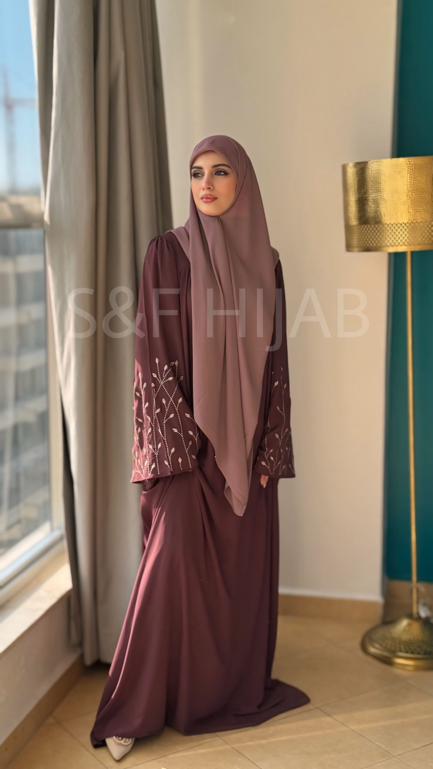 فستان طويل باللون المرطديلا الغامق مطرز في اليدين و مزين باحجار نحاسية بشكل يدوي